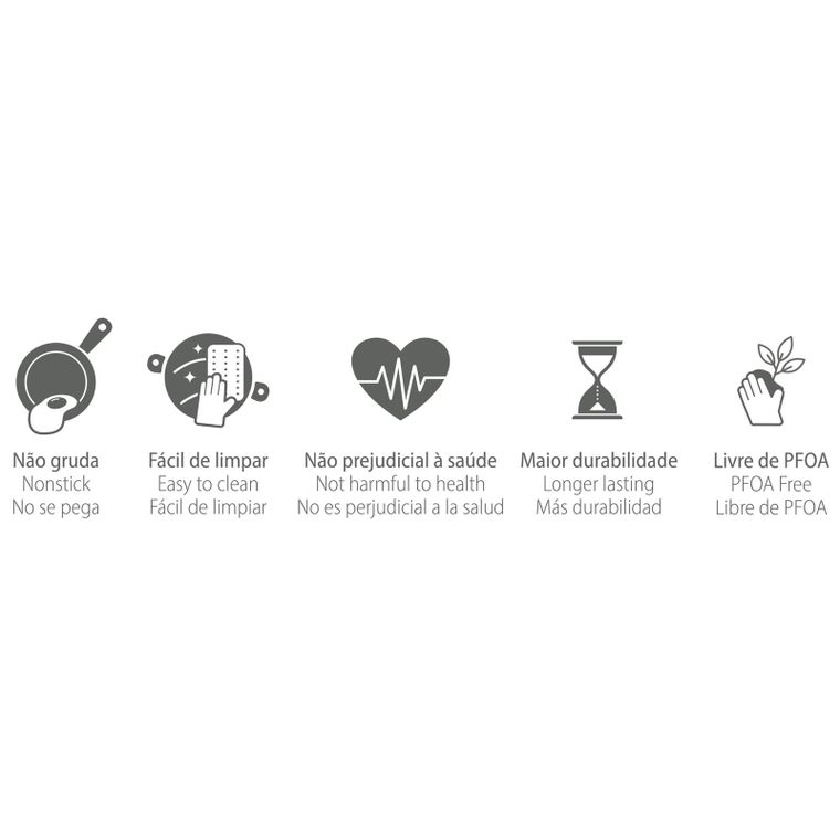 - Corpo de alumínio com espessura de 1,6 mm que proporciona cozimento rápido e uniforme.