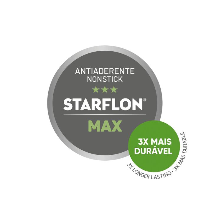 - Revestimento interno e externo de antiaderente Starflon Max que não gruda, é fácil de limpar, mais durável e não é prejudicial à saúde, pois é livre de PFOA.