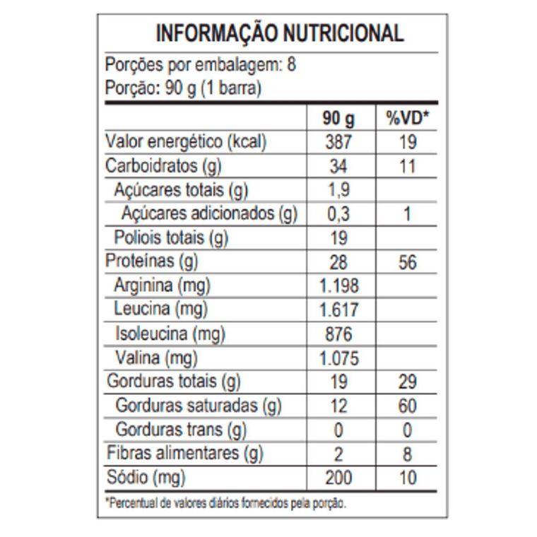Blend de proteínas (caseinato de cálcio, colágeno hidrolisado e proteína concentrada do soro do leite (WPC),cobertura de chocolate ao leite proteico zero açúcar, recheio de ganache sabor baunilha zero açúcar, óleo de girassol, cookies sabor chocolate zero açúcar, cacau alcalino, polidextrose, TCM, sal, edulcorante xarope de maltitol, umectante glicerina, emulsificante lecitina de girassol, aromatizantes e conservador sorbato de potássio.