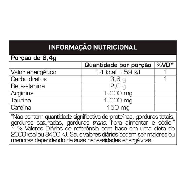 Isomaltulose, beta-alanina, Larginina, taurina, cafeína, aromatizantes, edulcorante sucralose, antiumectante dióxido de silício e corantes artificiais indigotina e azul brilhante fcf.