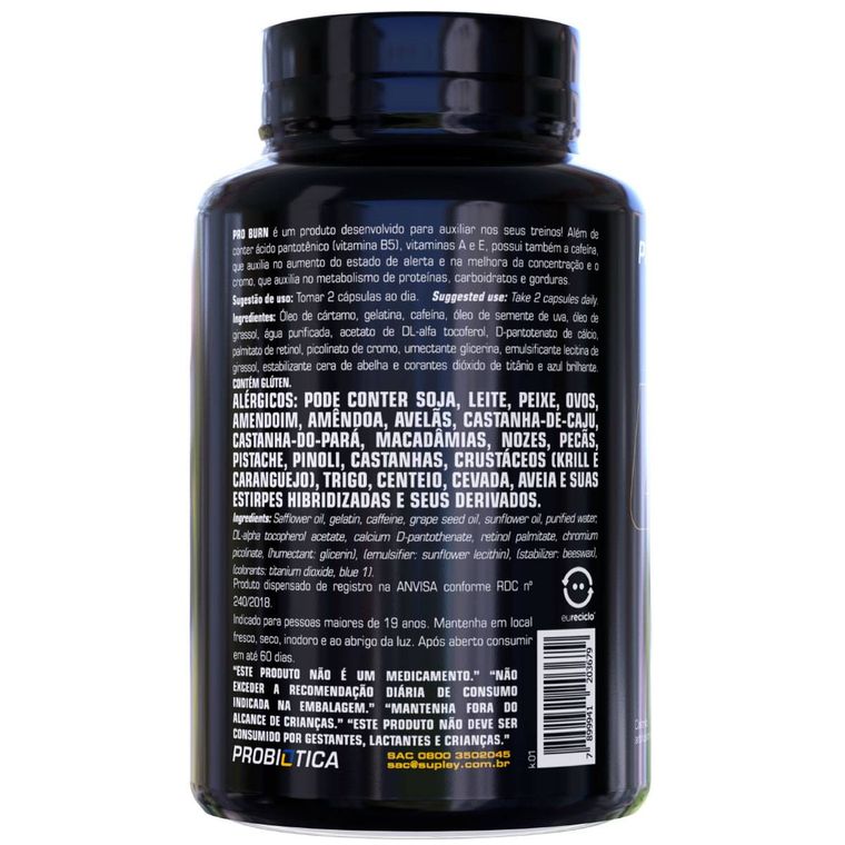 O PRO BURN é um produto desenvolvido para auxiliar nos seus treinos! Além de conter ácido pantotênico (vitamina B5), vitaminas A e E, possui também a cafeína, que auxilia no aumento do estado de alerta e na melhora da concentração e o cromo, que auxilia no metabolismo de proteínas, carboidratos e gorduras.