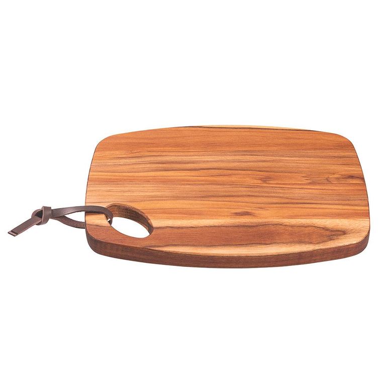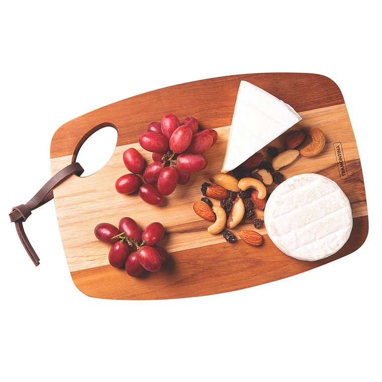 - Tábua para cortar e servir produzida em madeira tropical Teca de alta densidade com proteção em óleo mineral;