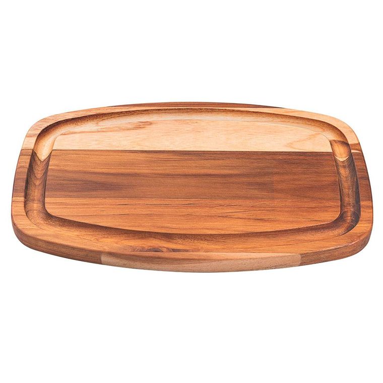 - Tábua para cortar e servir produzida em madeira tropical Teca de alta densidade com proteção em óleo mineral;