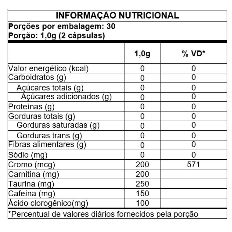 L-carnitina L-tartarato, extrato de café verde (fonte de ácido clorogênico), taurina, cafeína anidra, picolinato de cromo, agente de massa celulose microcristalina, lubrificante estearato de magnésio e antiumectante dióxido de silício.