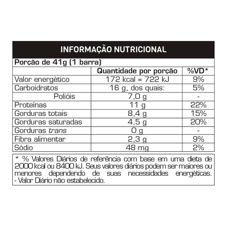 Cobertura sabor chocolate ao leite, recheio de ganache meio amargo zero adição de açúcar, proteína concentrada do soro do leite, caseinato de cálcio, colágeno hidrolisado, óleo de girassol, cacau alcalino em pó, edulcorantes xarope de maltitol e sucralose, umectante glicerina, emulsificante lecitina de girassol, aromatizante e antioxidante DL-alfa-tocoferol.
