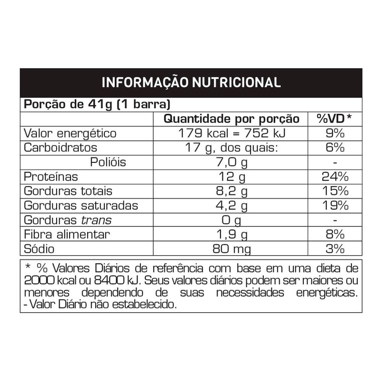Cobertura sabor chocolate ao leite, proteína concentrada do soro do leite, recheio de ganache sabor caramelo zero adição de açúcar, caseinato de cálcio, colágeno hidrolisado, óleo de girassol, polidextrose, sal, edulcorantes xarope de maltitol e sucralose, umectante glicerina, emulsificante lecitina de girassol, aromatizantes e antioxidante DL-alfa-tocoferol.