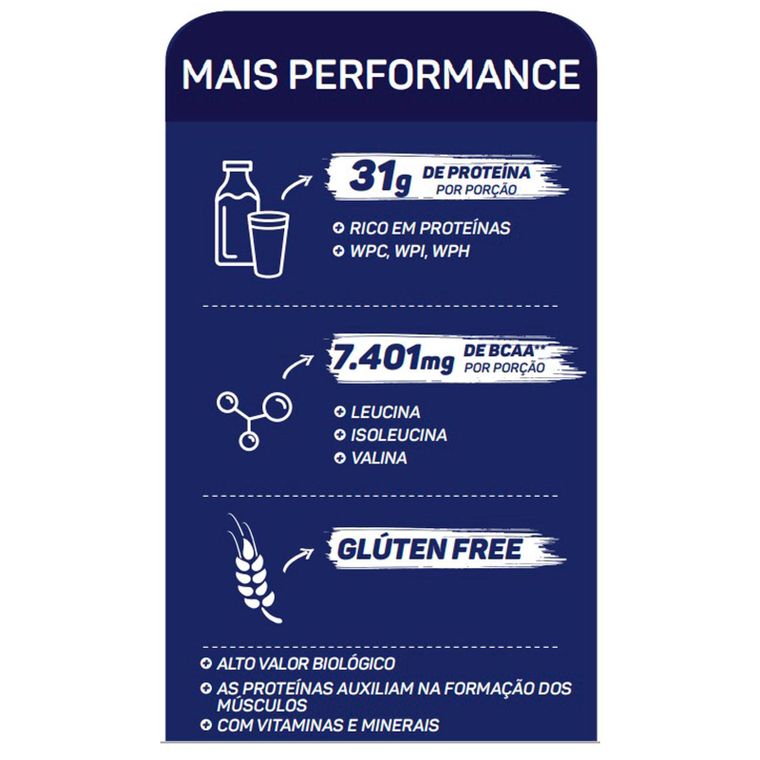 TOP WHEY 3W contém três tipos de proteínas do soro do leite: concentrada (WPC), isolada (WPI) e hidrolisada (WPH), matérias-primas com alta concentração de aminoácidos, principalmente BCAA. Essas características dessa fórmula exclusiva da Max Titanium, torna um produto extraordinário que auxilia na formação dos músculos e na recuperação muscular pós-treino. A linha Mais Performance fornece de 31g à 32g de proteínas por porção, contendo altas quantidade de aminoácidos essenciais (BCAA) e também é fortificada com 11 vitaminas e 6 minerais. Além disso, o Top Whey 3W é o suplemento proteico mais premiado do Brasil.
