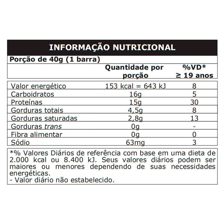 Pioneira no mercado de suplementos alimentares, a Whey Bar é uma barra a base de proteínas, com destaque para whey protein, contendo menos de 160 calorias por barra.Whey Bar é uma barra a base de proteínas, com destaque para whey protein, associada a carboidratos. Whey Bar contém adição de 12% da IDR (Ingestão Diária Recomendada) de vitaminas e minerais e apenas 151 calorias por barra.