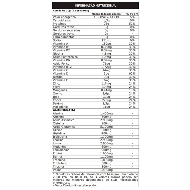 Proteína isolada do soro do leite (WPI), mix de vitaminas (ácido ascórbico (vitamina C), nicotinamida (niacina), DL-alfa acetato de tocoferol (vitamina E), pantotenato de cálcio (vitamina B5), cloridrato de piridoxina (vitamina B6), riboflavina (vitamina B2), nitrato de tiamina (vitamina B1), palmitato de retinol (vitamina A), ácido N-pteroil-L-glutâmico (ácido fólico), biotina, colecalciferol (vitamina D), cianocobalamina (vitamina B12)), mix de minerais (pirofosfato de ferro (ferro), sulfato de zinco (zinco), sulfato de manganês (manganês), sulfato de cobre anidro (cobre), iodeto de potássio (iodo), molibdato de sódio (molibdênio), picolinato de cromo (cromo), selenito de sódio (selênio)), aromatizantes, espessantes goma xantana e carboximetilcelulose sódica, edulcorante sucralose e emulsificante lecitina de soja.