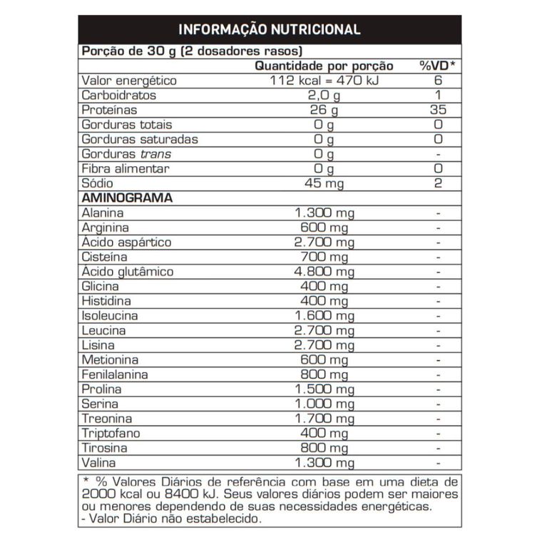 Proteína isolada do soro do leite (WPI), cacau alcalino, emulsificante lecitina de soja*, aromatizantes e edulcorante sucralose.